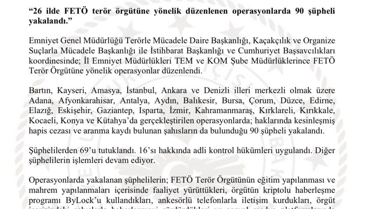 69 Şüpheli Tutuklandı Adliyeye sevk edilen 90 şüpheliden 69’unun çıkarıldıkları mahkemece tutuklandığı belirtilirken, 16’sı hakkında adli kontrol hükümleri uygulandığı açıklandı. Diğer şüphelilerin emniyetteki işlemlerinin devam ettiği bildirildi. Açıklamada, terör örgütlerine karşı yürütülen mücadelenin kararlılıkla sürdürüleceği vurgulanarak; operasyonları gerçekleştiren polis ekipleri ve Cumhuriyet Başsavcılıkları tebrik edildi.