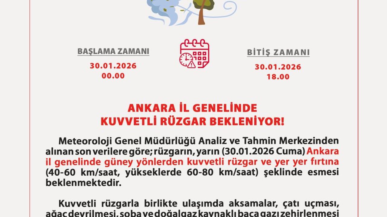 Uyarıya göre rüzgarın, 30 Ocak Cuma günü 00.00–18.00 saatleri arasında güney yönlerden 40–60 km/s, yüksek kesimlerde ise 60–80 km/s hızla esmesi bekleniyor.