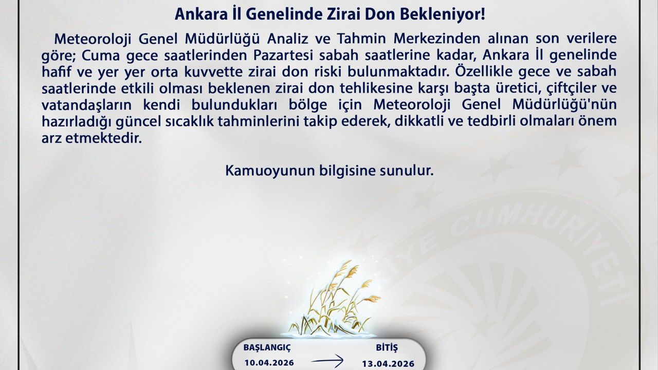 Ankara Valiliği tarafından yapılan açıklamada, Meteoroloji Genel Müdürlüğü Analiz ve Tahmin Merkezi'nden alınan son veriler paylaşıldı. Yapılan değerlendirmelere göre; Ankara il genelinde hafif, yer yer ise orta kuvvette zirai don riskinin bulunduğu tespit edildi. Söz konusu meteorolojik olayın özellikle tarımsal faaliyetlerin devam ettiği bölgelerde olumsuz etkiler yaratabileceği vurgulandı.