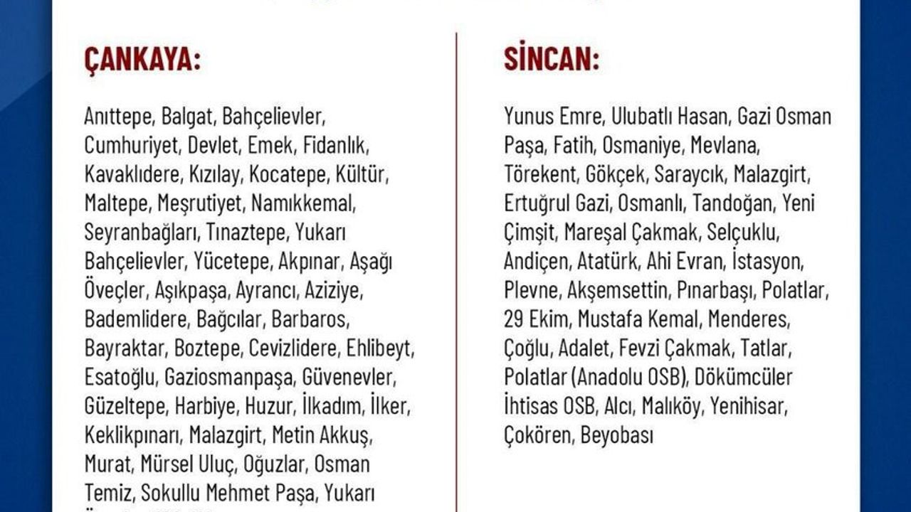 ÇANKAYA: Anıttepe, Balgat, Bahçelievler, Cumhuriyet, Devlet, Emek, Fidanlık, Kavaklıdere, Kızılay, Kocatepe, Kültür, Maltepe, Meşrutiyet, Namıkkemal, Seyranbağları, Tınaztepe, Yukarı Bahçelievler, Yücetepe, Akpınar, Aşağı Öveçler, Aşıkpaşa, Ayrancı, Aziziye, Bademlidere, Bağcılar, Barbaros, Bayraktar, Boztepe, Cevizlidere, Ehlibeyt, Esatoğlu, Gaziosmanpaşa, Güvenevler, Güzeltepe, Harbiye, Huzur, İlkadım, İlker, Keklikpınarı, Malazgirt, Metin Akkuş, Murat, Mürsel Uluç, Oğuzlar, Osman Temiz, Sokullu Mehmet Paşa, Yukarı Öveçler, 100. Yıl.