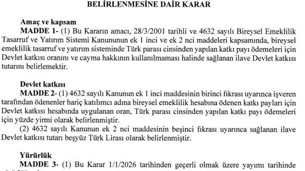 İlgili kararın 2. maddesi uyarınca; katılımcı adına bireysel emeklilik hesabına ödenen katkı payları için devlet katkısı hesabında uygulanan oran, Türk Lirası cinsinden yapılan ödemeler için yüzde 20 olarak yeniden belirlendi.