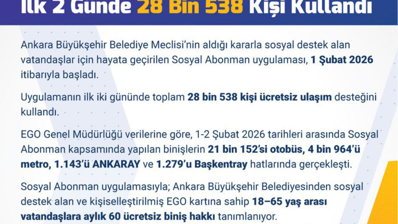 Açıklanan verilere göre, 1-2 Şubat 2026 tarihleri arasında toplam 28 bin 538 kişi Sosyal Abonman kapsamında ücretsiz ulaşım hakkını kullandı.
