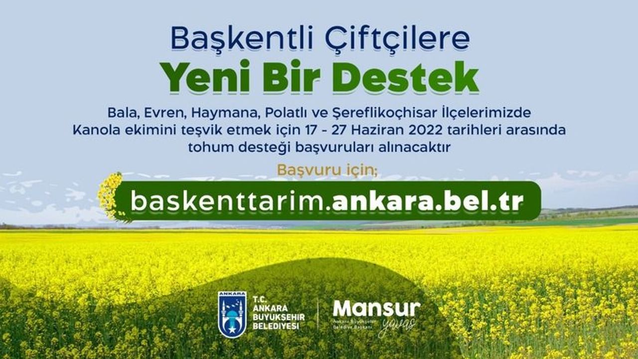 ABB şimdi de Bala, Evren, Haymana, Polatlı ve Şereflikoçhisar ilçelerinde ‘Kanola’ ekimini teşvik etmek için ilk kez kanola tohumu desteğinde bulunacak. Kırsal Hizmetler Daire Başkanlığı, 17-27 Haziran 2022 tarihleri arasında online ortamda talep toplama başvurularını alacak.