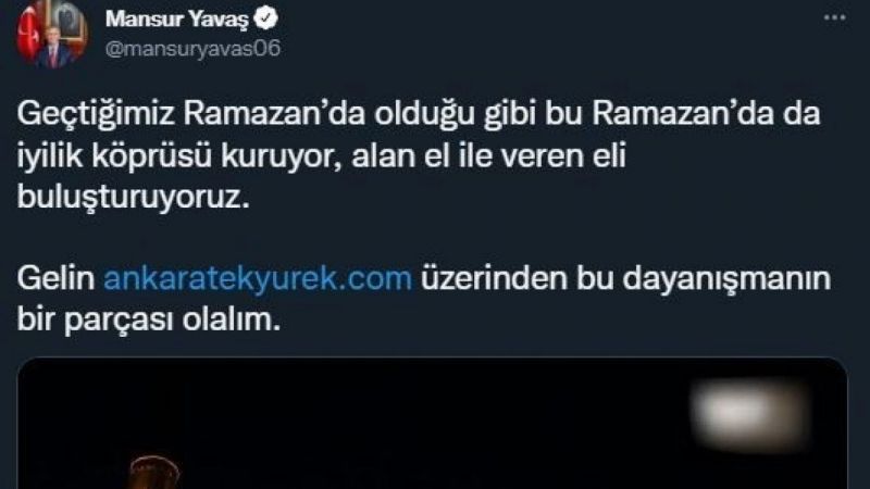 Ankara Büyükşehir Belediye Başkanı Mansur Yavaş, pandemi sürecinde sosyal yardım alan vatandaşlara ekonomik yönden destek olmak amacıyla ilk kez 13 Mayıs 2020 tarihinde başlattığı ve 2021 yılında da devam eden “ 6 Milyon Tek Yürek” kampanyasını bu yıl Ramazan ayı öncesi yeniden başlattı. ABB Başkanı Mansur Yavaş sosyal medya hesapları üzerinden toplumsal dayanışma çağrısını bir kez daha yineleyerek, “Geçtiğimiz Ramazan’da olduğu gibi bu Ramazan’da da iyilik köprüsü kuruyor, alan el ile veren eli buluşturuyoruz. Gelin ‘ankaratekyurek.com’ üzerinden bu dayanışmanın bir parçası olalım” dedi.
