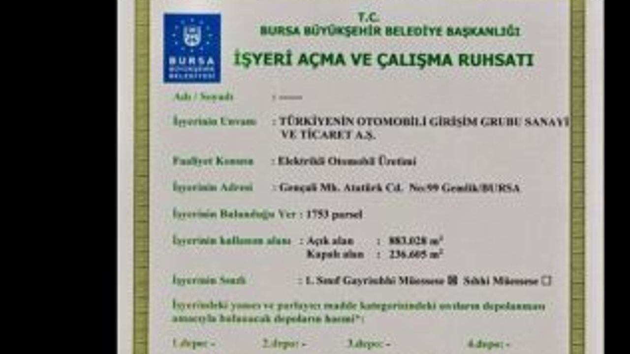 Gemlik ilçesinde 883 bin 28 metrekare ıçak alan 236 bin 605 metrekare kapalı alanda Elektrikli Otomobil Üretimi için kurulan fabrikanın ruhsatı da imzalanmış oldu. 28 Ekim tarihli 3879 nolu ruhsat fabrikanın resmi olarak çalışmasına imkan sağlıyor.