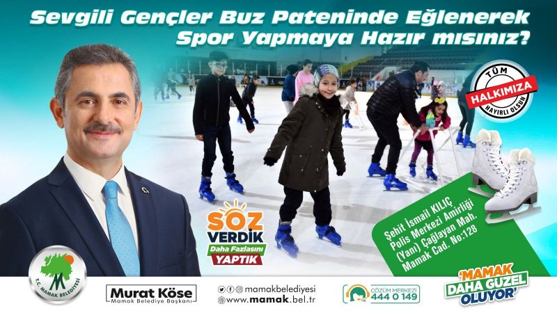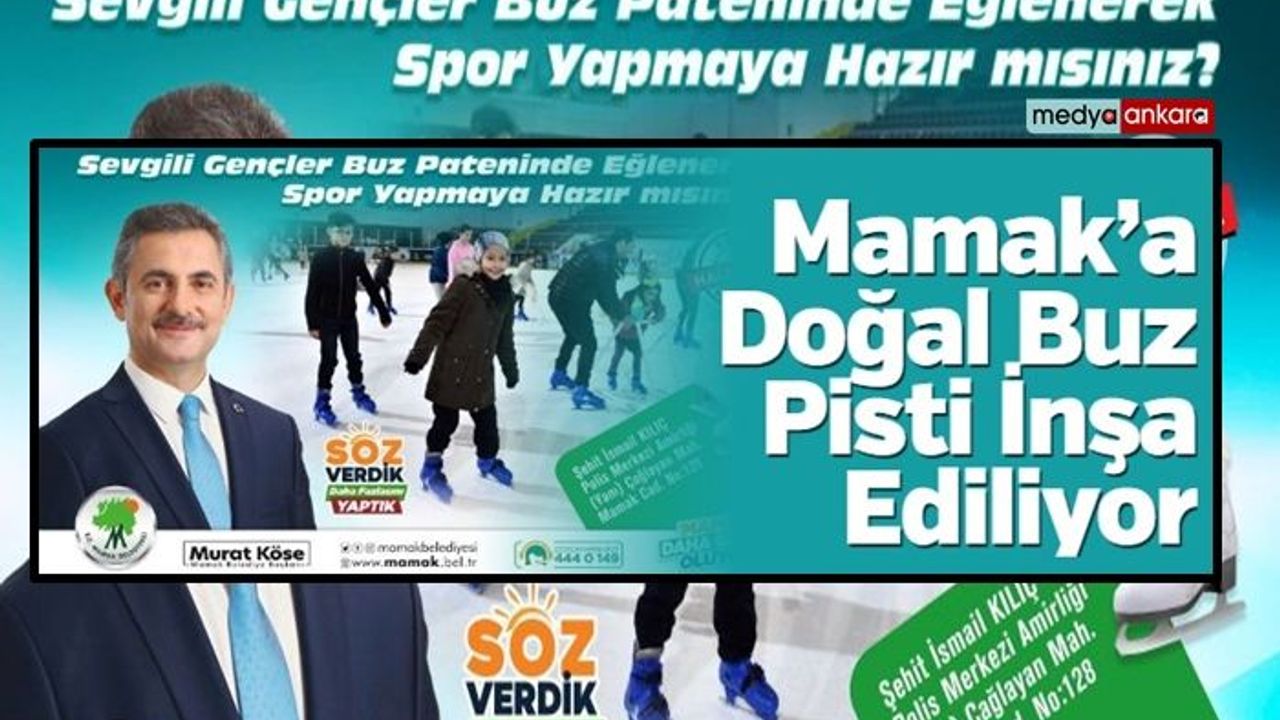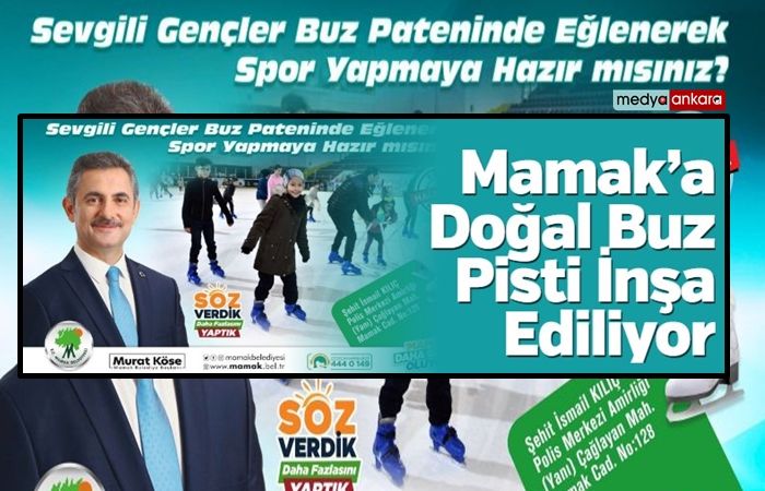 Mamak Belediyesi, spor yatırımlarında bir ilke daha imza atıyor. Gençleri spor ve sanatın çeşitli dallarıyla buluşturan Mamak Belediyesi, Mamaklı gençleri buz pateniyle de buluşturmaya hazırlanıyor. Olimpik buz pisti sistemi ile aynı standartlara sahip, 420 metrekarelik alana inşası yapılan doğal buz pistinde 150 kişilik tribün de olacak. Kış aylarında hizmet vermesi planlanan doğal buz pisti Mamaklıların gözde merkezi haline gelecek.