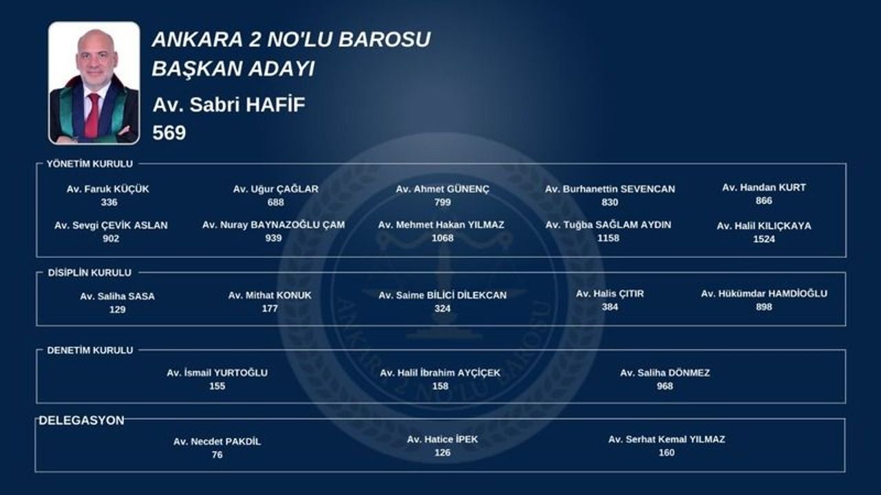 Av Faruk Küçük, Av Ahmet Günenç, Av Burhanettin Severcan, Av Handan Kurt, Av Sevgi Çevik Aslan, Av Nuray Baynazoğlu Çam, Av Tuğba Sağlam Aydın, Av Halil Kılıçkaya Yönetim kurulu üyesi adayı , Av Saliha Sasa, Av Mithat Konuk, Av Saime Bilici Dilekcan, Av Halis Çıtır, Av Hükümdar Hamdioğlu Disiplin Kurulu Üyesi adayı, Av İsmail Yurtoğlu, Av Halil İbrahim Ayçiçek, Av Saliha Dönemez Denetim Kurulu Üyesi adayı olarak yer alıyor. Türkiye Barolar Birliği Delegasyon Adayı olarak Av Necdet Pakdil, Av Hatice İpek, Av Serhat Kemal Yılmaz listede yer aldı.