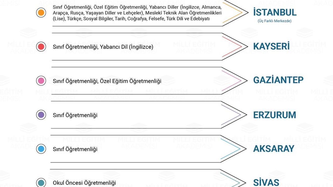 Sınıf öğretmenliği branşı, en fazla merkezde hazırlık eğitimi alacak alan oldu. Bu kapsamda 2.816 kontenjan ayrılan sınıf öğretmenliği adayları Aksaray, Erzurum, Gaziantep, Kayseri, Ankara ve İstanbul’daki eğitim ve uygulama merkezlerinde eğitim görecek.
