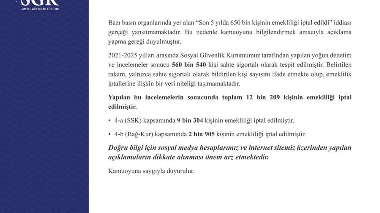 SGK, kamuoyunun doğru bilgilendirilmesi amacıyla resmi açıklamaların dikkate alınması gerektiğini vurguladı.