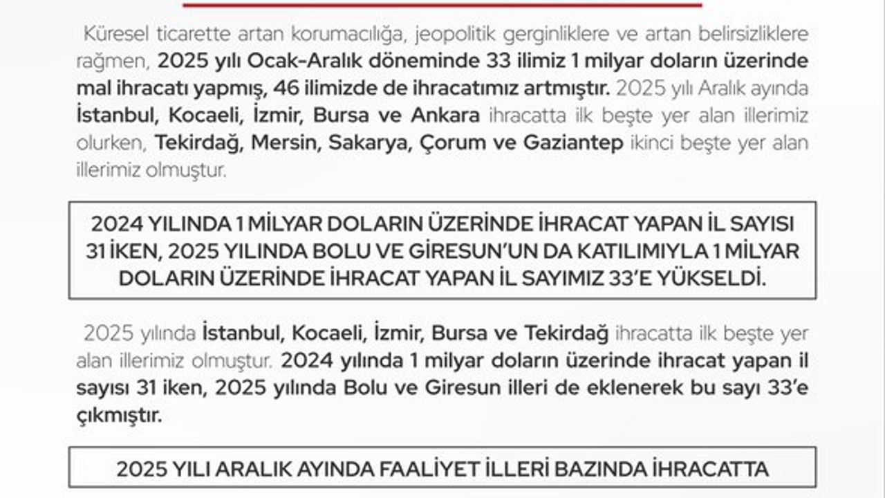Veriler, ihracatın yalnızca belirli merkezlerde değil, farklı illere yayılarak büyüdüğünü gösterdi.